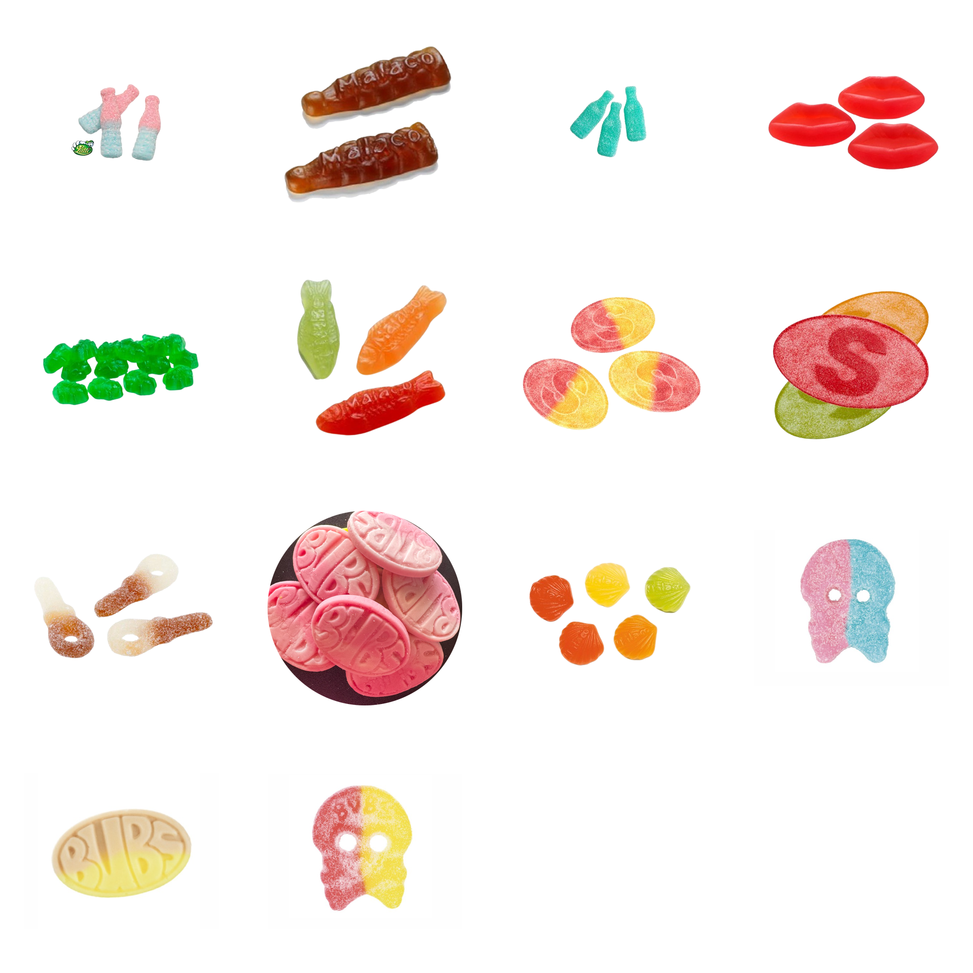 Sugar, Glucose Syrup, Fructose Syrup, Starch, Acids (Citric Acid, Tartaric Acid), Natural and Artificial Flavors, Color (Carmine).